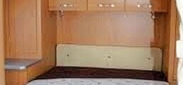 Neben dem innovativen Doppelhubbett, das sich von oben herabsenkt, befindet sich ein festes Doppelbett im Heck des Wohnmobiles. Die Arbeitsfläche im Küchenbereich verläuft entlang der Ecke und bietet so idealen Platz zum Arbeiten.